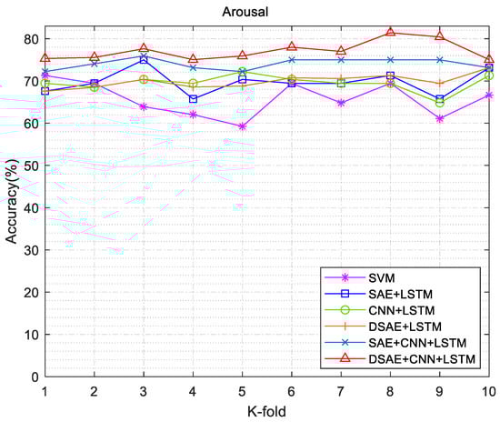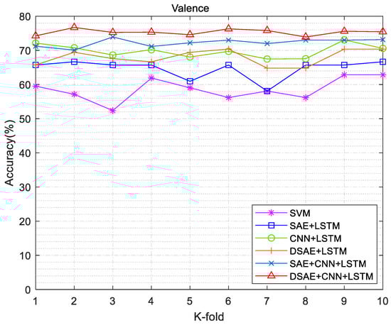 We conducted exhaustive experiments to demonstrate the state of the art of DCRNN in sentiment classification. In the comparison experiments, we used SVM as the classifier to set the baseline accuracy. The feature extraction method was changed. For each channel of EEG data, the Welch method was used to calculate the PSD values; then, the frequency band power (FBP) for the four different bands was calculated using integration. The extracted features were fed into the SVM model, whose “RBF” kernel allowed for better differentiation between the different categories. All hyperparameters were left at their default values. The method in this work was mainly divided into two aspects: (1) The encoding and decoding process of DSAE was used to reduce the dimension of EEG signals and remove redundant information. (2) We used the CNN + LSTM combined neural network to classify the emotional features of the EEG signals after dimension reduction. The specific experimental combination operations are shown in Table 3. The 10-fold cross-validation experiments were used in the experimental process, and the SVM method was used as the basic method for comparison. The valence and arousal accuracy results of different experimental validation methods are shown in Figure 12 and Figure 13. DSAE + CNN + LSTM had a better sentiment classification effect.