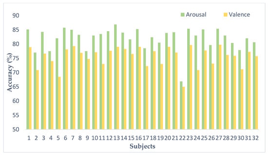 Classification accuracy was recorded for each subject. As can be seen in Figure 14, there were differences in classification accuracy for different subjects. In terms of the arousal classification, the average correct rate for the 32 subjects was 81.4%, with a classification accuracy of 86.88% (the highest) for subject 13 and 66.87% (the lowest) for subject 22. In terms of valence, the average correct rate for the 32 subjects was 76.70%; for subject 23, classification accuracy reached 79.63% (highest) and for subject 22 accuracy was 65% (lowest). This reflects individual variability. It is noteworthy that the validity and arousal accuracy for subject 22 was 66.87% and 79.63%, respectively, which were lower than the other subjects. The reason for this may be that the subjects lacked attention during the experiment or did not report well on the extent of subjective feelings after the watching the video.