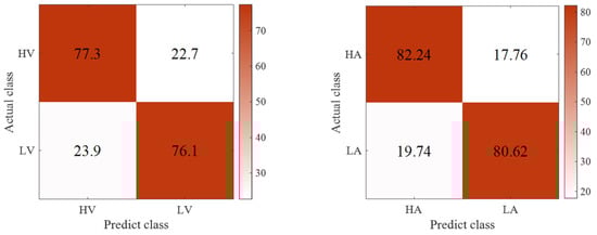 Confusion matrix: (left) valence, (right) arousal.