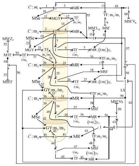Bond graph theory offers the ability to model systems in a structural and generalized way [21,22,23]. These systems can be linear, nonlinear, time-varying with concentrated or distributed parameters. From a bond graph model, the mathematical model of the system in a transfer function or in state space can be obtained. Various important system analysis tools such as stability, controllability, observability, linearization and steady state in bond graph models can be determined directly [24]. Furthermore, the use of the bond graph in the controller design has been extended. One of the great advantages of bond graphs is the ability to model systems composed of electrical, mechanical, hydraulic, thermal and chemical sections [25].