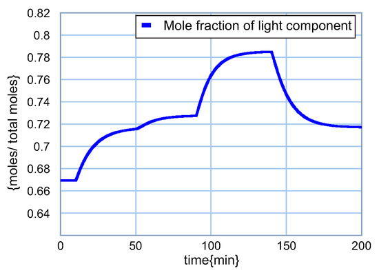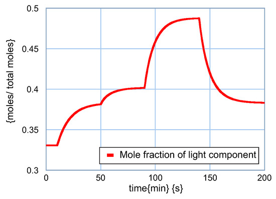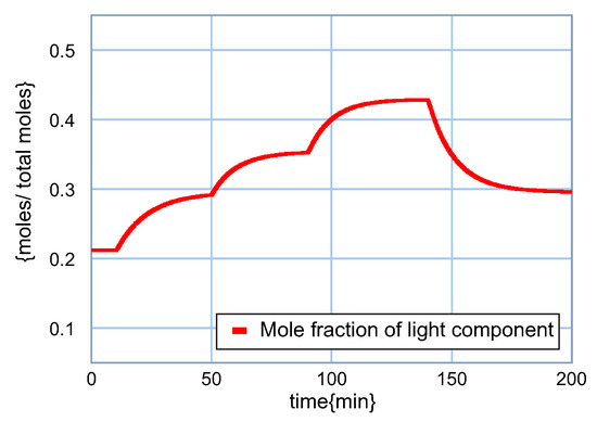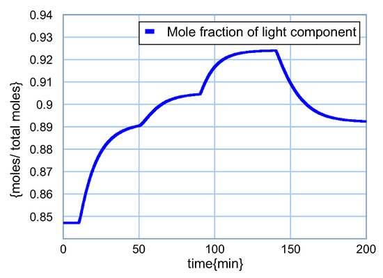 - Any action that causes an increase in the concentration of the most volatile component within the system automatically causes a corresponding increase in its concentration in each of the stages, which in the model corresponds to the state variables , particularly in the variables output and , which represent the mole fraction of light in the distillate and in the bottom stream.