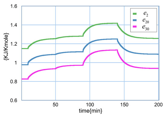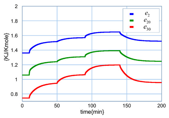The response of the chemical tensions have forms similar to the concentration of the light component because it depends directly on this concentration. From the bond graph point of view, the measurement of these chemical tensions is the detection of efforts in the 0-junctions connected to , and . Therefore, the use of the bond graph model of the distillation column allows for the detection of other variables, including chemical power.