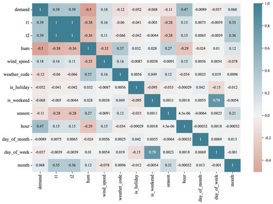 There is correlation between different features in the data, resulting in feature redundancy. In addition, not all influencing factors are related to the demand for bike-sharing. The correlation analysis aimed to investigate the correlation between bike-sharing variables, i.e., a preliminary analysis of other variables that are correlated with the demand for bike-sharing. After the normality test, the data of most of the variables used in this study did not conform to a normal distribution. Therefore, we used Spearman’s rank correlation coefficient for measuring the linear correlation between the variables [32].