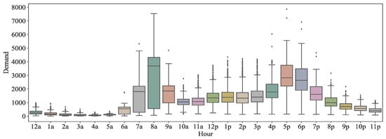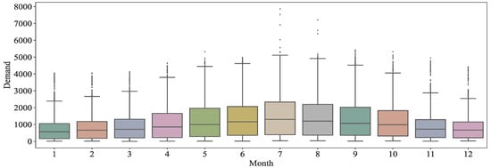 First, we assessed the distribution of the demand for bike-sharing in different months, and the results are shown in Figure 2. The demand shows an obvious single hump shape that develops with the month, i.e., the demand for bike-sharing in the area gradually increases from January until it peaks in July, and it then starts to decrease month by month.