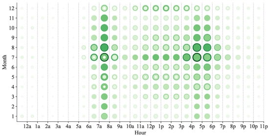 We analyzed the distribution of bike-sharing demand by month at different moments of the day with bubble chart statistics, where in larger bubbles indicate higher demand. The statistical results are shown in Figure 4. As can be seen, the vast majority of months show a double-hump distribution of demand. However, in December, demand for shared bikes increases when people are at work, while demand is roughly the same throughout the afternoon from 12:00 to 6:00, with no clear trend. This may have more to do with the local climate as well as holidays.