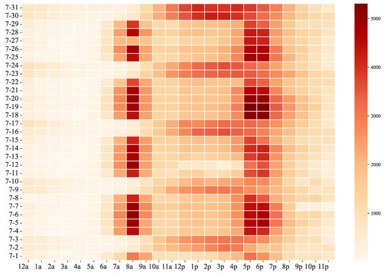 It is known from the previous analysis that July is the month with the highest demand for bike-sharing; so, we took July 2016 as the research object and analyzed the daily demand changes in this month using heat maps, and the statistical results are shown in Figure 5. It can be seen that there is an obvious cycle pattern in the demand distribution, with every seven days being a cycle, and the demand distribution on five of the days corresponds to the weekday travel characteristics, i.e., the obvious double-hump feature of on and off work. This also reflects the obvious difference in the distribution of demand on weekdays and non-working days. There is a high demand for bike-sharing on July 30 and 31, which may be related to the local Prudential Ride London event, a popular ride that locals say turned London into a bicycle-centric environment.