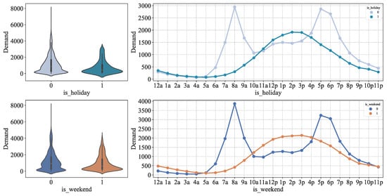 We found in the previous analysis that there is a significant difference in the distribution of bike-sharing demand between weekdays and non-weekdays. Therefore, we took weekends and holidays as the research object and used weekday data for comparative analysis, and the analysis results are shown in Figure 6. It can be seen that the distribution of people’s travel characteristics on holidays and weekends is roughly the same. On weekdays, 8:00 and 17:00 and 18:00 are the peak times for car use, which coincides with the time points for going to and leaving work. In the case of nonworking days 14:00–15:00 is the real peak period of car usage. This reflects people’s preference for using shared bikes to travel in the afternoon during nonworking days.