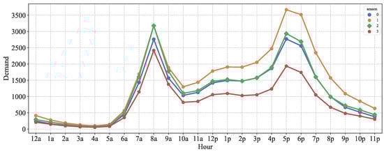 In addition, we analyzed the distribution of bike-sharing demand by season at different moments of the day through line graph statistics. The results are shown in Figure 7. It can be seen that the trend of bike-sharing demand is more or less the same in different seasons, with higher demand in summer and autumn, and the lowest in winter, which is obviously related to the seasonal climate.