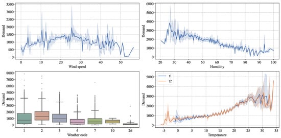 Many studies have shown that, as external environmental factors, weather type [34], temperature [35], and air quality [36], also have direct and indirect effects on travel characteristics. To investigate the influence of weather characteristics on bike-sharing trips, we obtained the trends of bike-sharing demand with wind speed, humidity, weather type, and temperature using line plots as well as box plots. The results are shown in Figure 8. It can be seen that there is a local peak at a wind speed of 25 km/h, and the demand decreases at higher and lower wind speeds. There is a negative correlation between air humidity and demand; that is, with greater air humidity, the overall demand shows a decreasing trend. In weather codes 2 and 3, that is, when the weather type is either less cloudy or cloudy, the demand is larger; when the weather is more severe, the demand gradually decreases, and when the weather code is 26 (snow), the demand is almost 0. The demand shows a trend of increasing first and then decreasing with the rise in temperature; that is, below the temperature is 25 °C, the demand shows a relatively strong positive correlation with temperature, and after the temperature exceeds 25 °C, the demand shows a relatively weak negative correlation with temperature.
