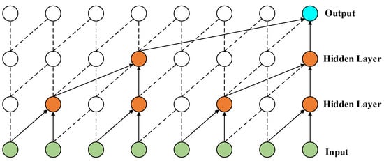 The causal convolutions were originally proposed in the WaveNets [41] networks for learning the input audio data before moment to predict the output at moment . Compared to RNNs, no circular connections are used in models using causal convolutions, so time series data can be input in parallel, which allows for faster network training, especially for large-sample time series [42]. However, standard causal convolution requires increasing the receptive field of neurons in the neural network by stacking many network layers or using very large convolutional kernels when dealing with large sample time series. For this reason, TCN uses the Dilated Causal Convolution (DCC) technique to achieve an increase in the perceptual field without a significant increase in computational cost. DCC is a convolution operation that performs a step-skipping operation on the input sequence, and its expression is given by Equation (4):
