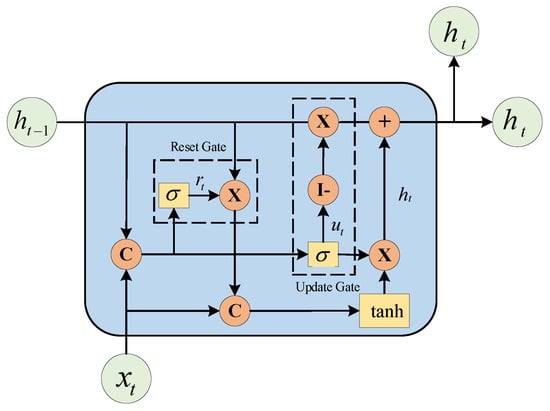 LSTM [46] and GRU [47] show strong potential applicability in the data prediction problem studied in this paper, with GRU performing slightly better. Compared with the LSTM method, GRU requires fewer training parameters, is easier to converge and can reduce the risk of model overfitting in the case of limited time series data. GRU optimizes the three gate functions of LSTM, turning the set of forgetting gates and input gates into a single update gate, and mixing the neuron states with the hidden states. This can effectively alleviate the problem of “gradient disappearance” in RNN networks and reduce the number of parameters of LSTM network units, shortening the training time of the model. The basic structure is shown in Figure 10, and the mathematical description is shown in Equations (6)–(10):