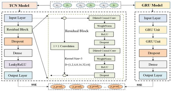 TCN is a novel architecture based on a Convolutional Neural Network (CNN). Unlike general CNNs, TCNs use structures such as expanded causal convolution and residual blocks [38,39,40]. This gives them the ability to extract features and achieve prediction from large sample time series, and TCNs can effectively address the performance degradation of deep networks during network training. TCN consists of dilated, causal 1D fully convolutional layers with the same input and output lengths. The convolution in the TCN model is causal convolution, wherein the layers are causally related to each other, thus ensuring that no historical information or future data will be missed. In addition, TCN can map sequences of arbitrary length to output sequences of the same length, using residual modules and dilation convolution to better control the memory length of the model and improve the predictive power.