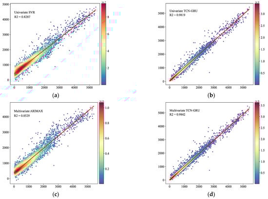Model scatter density plot. (a) Univariate SVR scatter density plot. (b) Univariate TCN-GRU scatter density plot. (c) Multivariate ARIMAX scatter density plot. (d) Multivariate TCN-GRU scatter density plot.