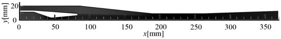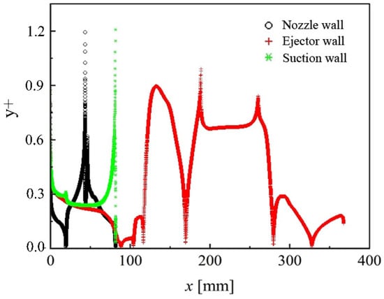 A 2-D axisymmetric ejector mesh with refinement in the area of boundary layers and shock waves was established, as shown in Figure 2. The value of y+max is less than 1.2, as shown in Figure 3. It is because when y+ ≈ 1, the low-Re boundary conditions that are suitable for the complex flow are adopted in the k-ω Standard, k-ω SST, and Transition SST models. Moreover, the scalable wall functions are adopted in the Linear RSM and k-ε series models [23]. The scalable wall functions avoid the deterioration of standard wall functions under grid refinement below y+ < 11 because it forces the usage of the log law in conjunction with the standard wall functions approach [23].