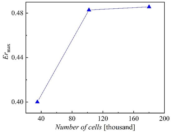 The mesh independence study is achieved with a coarse mesh with 40,000 elements, a medium mesh with 87,000 elements, and a fine mesh with 186,000 elements. Figure 4 illustrates that the simulation results are very close for the last two meshes. The GCI method is a way to measure the relative discrete error of the computed solution with different mesh levels [27]. GCI study results indicate that the medium mesh with 87,000 elements has a low GCI value and relative discrete error, as shown in Table 2. Additionally, its solution duration and memory usage are lower than those of the fine mesh. As a result, the medium mesh with 87,000 elements is adopted in this work.