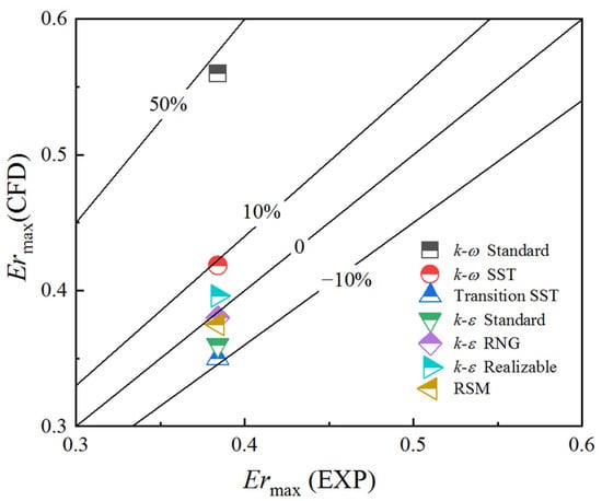 The Ermax obtained by the k-ω Standard is considerably higher than experimental data with a relative error of 46%. The Ermax predicted by the k-ω SST, k-ε Realizable, k-ε RNG, Linear RSM, k-ε Standard, and Transition SST model are within an acceptable range, as shown in Figure 5. The k-ε RNG has an additional term in its turbulent dissipation rate equation that improves the accuracy for rapidly strained flows. The k-ε Realizable contains an alternative formulation for the turbulent viscosity, and a modified transport equation for the dissipation rate has been derived from an exact equation for the transport of the mean-square vorticity fluctuation [23]. Therefore, the simulation results of the k-ε RNG and k-ε Realizable are better than that of the k-ε Standard.
