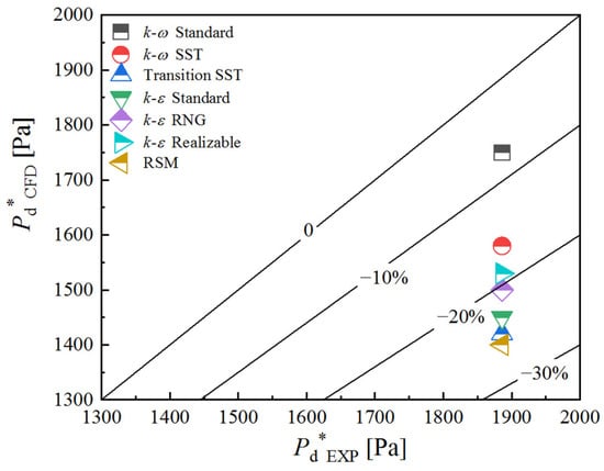 Figure 6 illustrates the relative error of Pd* of the different turbulence models. The Pd* predicted by the seven models are all below the experimental data, which is consistent with the findings of the majority of scholars [9,19,28,29,30,31]. The relative errors of the k-ω Standard, k-ω SST, and k-ε Realizable model which are all below 20% are acceptable.