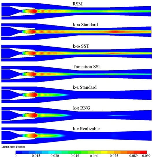 Figure 8 describes the condensation around the axis of mixing chamber and diffuser predicted by the Linear RSM, k-ω Standard, k-ω SST, Transition SST, and k-ε RNG model. The first four models predict that the condensation appears from the nozzle expansion section and passes through the vicinity of the ejector axis to the diffuser outlet. The k-ε RNG only predicts the condensation in the contraction of the mixing chamber and the diffuser entrance. The other two models only predict the condensation in the contraction of the mixing chamber. Chen and Sun obtained water droplets in the whole mixing chamber in visualization experiments [1]. Therefore, the simulation results of the k-ω Standard, k-ω SST, Linear RSM, and Transition SST models are consistent with the experimental results in relevant aspects.