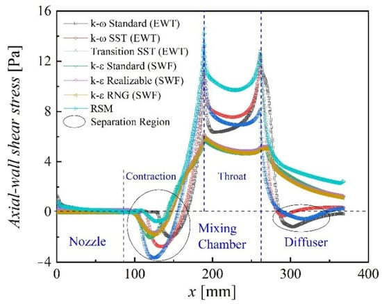 Chen and Sun found that a circulating flow exists in the edge region of the contraction of the mixing chamber in their visualization experiments [1], and the same is true in the seven turbulence models predicted. Moreover, the k-ω Standard, k-ω SST, and Transition SST also predict the boundary-layer separation in the diffuser, whereas the other models only predict that in the contraction of the mixing chamber, as shown in Figure 9.
