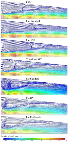 A sudden drop of Ma indicates that a shockwave appears in the flow field. A sudden rise of Ma indicates that an expansion wave occurs. The flow direction is vertical to the surface of a normal shock wave, which does not change after the normal shock wave. The direction changes after passing through an oblique one. The number and type of shockwaves predicted by different turbulence models are different, as shown in Figure 7.