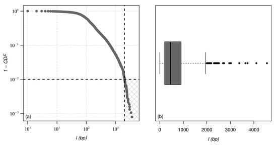By plotting the cumulative probability distribution function (CDF) and a box plot for chromosome 02 of one of the species studied here (Figure 1), we can see that some points are very far from the distribution and can be considered outliers. There are various techniques for defining, spotting, and dealing with outliers [45]. In this work, we decided to use the box plot approach. Outliers in this approach are points that are below the region and above , where , , and are first, second, and third quartile, respectively, and is the interquartile region defined as . To prevent these points from influencing the behavior of the proposed models, we decided to remove them. The cut was made around 1% of the cumulative distribution, designated by the hatched square in the lower right corner of Figure 1a. A similar approach has been proposed in [46] to analyze the length distribution of human DNA. Table A1 describes the statistical characteristics of some chromosomes of the three species of Cucurbitaceae after removing these outliers.