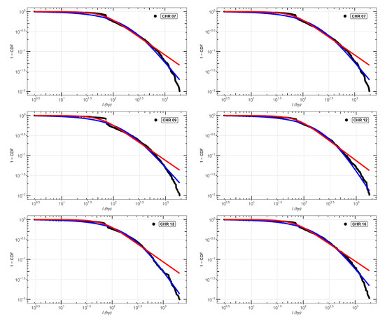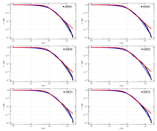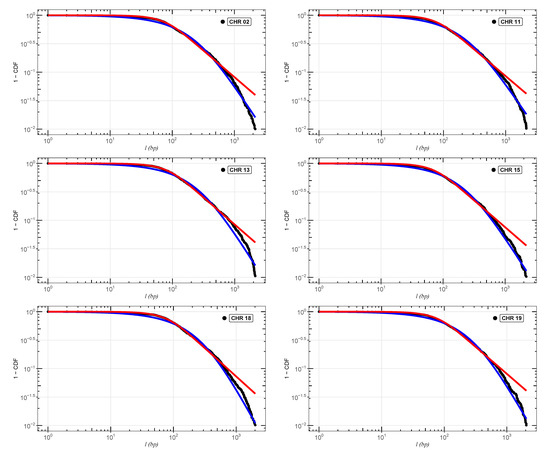 In Figure 2, Figure 3 and Figure 4, we show the cumulative distributions, for exons, for some chromosomes of Cucubita maxima, Cucurbita moschata, and Cucubita pepo, with the other chromosomes behaving similarly. To get the best fit values for , the distribution functions (9) and (11) were fitted to the lengths (l). Table A4, Table A5 and Table A6 show all numerical results for the parameters , and for distribution (9) in addition to and for distribution (11). Chromosome numbers are displayed in the first column (CHR), and the number of nucleotide chains is displayed in the second column (N) (exons). The correlations between the values of l are measured by the values of [26,27,28,39]. According to [36,47], the coding part of human DNA tends to present short-range correlations. The same behavior for plant DNA can be observed in [34]. This implies values close to zero. It is worth remembering that in the limit , we return to the well-known Boltzmann–Gibbs–Shannon statistics [26].