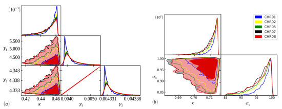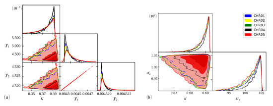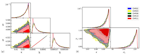 In Table A4, we have the parameter ranges for Cucubita maxima. Considering all chromosomes (CHR), , , for cumulative distribution (11), and , and for cumulative distribution (9). The process is repeated for the species Cucubita moschata in Table A5 and Cucubita pepo in Table A6. The MULTINEST algorithm, a Bayesian inference tool that computes the evidence with an associated error estimate, is thus put into practice for each species and each model. It generates posterior samples from distributions that can contain multiple modes and pronounced degeneracy (curves) in high dimensions. More details can be seen in [49,50,51,52,53].