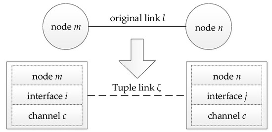 Algorithm implementation: Authors of [27] proposed a mathematic model in which each node, channel, and interface are modeled as a Tuple. At the same time, the original links are transformed into Tuple links. Thus, the multi-channel environment can be virtualized into a single-channel network, as shown in Figure 4.