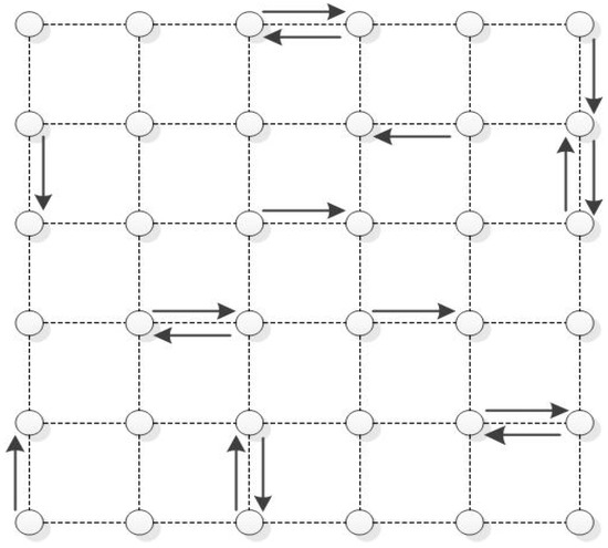 In this section, we use NS-2.31 software to simulate actual network scenarios and compare the throughput and delay performances of several existing wireless scheduling strategies. We use the topology shown in Figure 5, which has 36 nodes and 60 links. There are 16 data flows (represented by arrows) in the topology, and each data flow goes through a one-hop transmission. Assume that all data flows have the same data transmission rate (input load) of λ. In a single-channel environment, all links share one available channel to transmit data. In a multi-channel environment, the interface (network card) of a node can switch between four different channels with the channel capacity of 1, 1, 2, 2 respectively. The simulation parameters adopted in our experiments are shown in Table 2.