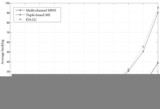Figure 6 shows the throughput performance comparison of the centralized MWS, the distributed MS and the Q-SCHED strategies in single-channel environment. As we can see from the simulation data, the value of the average backlog increases sharply when the input load increases gradually to a certain threshold, which means that the input load has reached the boundary of the throughput capacity region that can be ensured by the scheduling policy. Compared with MS and Q-SCHED, MWS can guarantee a larger capacity region because MWS is a centralized throughput-optimal algorithm. At the same time, the throughput performances of MS and Q-SHCED are very close because the right-hand side of the inequality sign of (9) can arbitrarily approach to 1. In terms of implementation complexity, Q-SCHED has the lowest complexity due to the random access technology whereas the centralized implementation brings a high complexity to MWS.