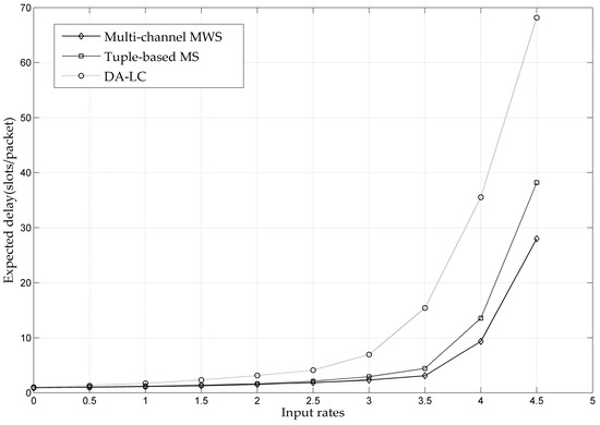 Figure 9 shows the end-to-end average delay performance of the MWS, Tuple-based MS and DA-LC algorithms. According to the analysis in the previous section, the MWS and Tuple-based MS can guarantee the strong stability of the network, whereas the DA-LC can only ensure the weak stability. Therefore, the delay performance of the MWS and Tuple-based MS is much better than that of the DA-LC, which can be clearly reflected in the figure. It can be obtained from the simulation experiments that the delay performance of the single-channel Q-SCHED or the multi-channel DA-LC scheduling policy is worse than that of other comparable scheduling algorithms. However, the implementation complexity of Q-SCHED or DA-LC does not increase with the network size. Hence, one can understand that they sacrifice delay for the reduction of complexity.