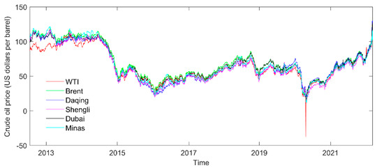 This paper selects the China–Daqing and China–Shengli crude oil spot prices and their four reference benchmark oil prices as the sample data. The WTI and Brent crude oil future prices are the global representative benchmark oil prices. Dubai and Minas crude oil spot prices can be selected according to the China pricing rules. This paper covers the daily crude oil price in each time series, from 13 July 2012, to 10 March 2022. Each time series consists of 2333 daily crude oil prices (US dollars per barrel), and the database can be obtained from the wind database and the websites of the Energy Information Administration (http://www.eia.gov).
