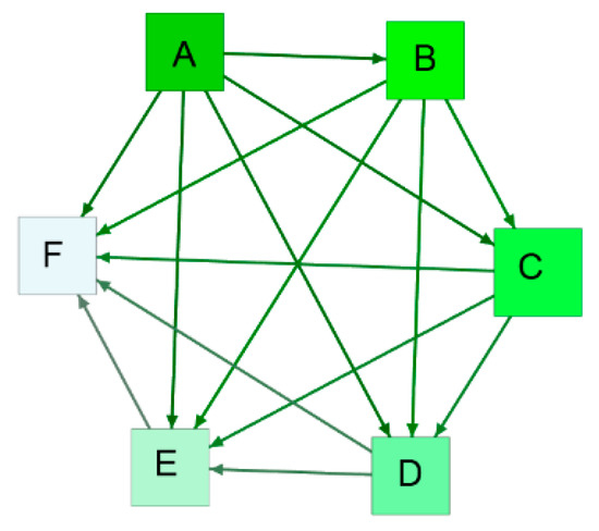 Based on this algorithm, an information spillover network in a segment is obtained. Thus, a sequence of information spillover networks from the multivariate oil time series in a scale can be obtained, and these networks form an evolutionary process, which can be described as , where is the number of information spillover networks on a time scale. Figure 2 shows an example of an information spillover network and indicates that there is a directed edge between any two series. For instance, the directed edge from A to D indicates that A acts as an information spillover transmitter and D acts as an information spillover receiver. The topological structures of these networks can reveal the dynamics of spillovers among oil series.