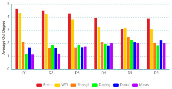 Figure 3 exhibits the dynamic out degree for each oil series on a time scale (D1). The dynamic out degree of each oil series on the other time scales is shown in the Appendix A. The results imply that the number of information spillover flows from an oil series and its neighbors in the time scale is time-varying. The dynamic features in different time scales of out degree are different, indicating that the dynamic feature is related to time scales. Furthermore, the average out degree of an oil series at different time scales is given in Figure 4. For instance, on a time scale D1, Brent has the highest average out degree, and Minas has the smallest value. This reflects that Brent, as an information spillover transmitter, has the largest number of neighbors, and Minas has the lowest number of neighbors. In addition, with the increase in the time scale, the average out degree of Brent (WTI) shows a downward trend, and that of Daqing (Dubai/Minas) exhibits an upward trend. This indicates that the number of neighbors of Brent (WTI), as a spillover transmitter, shows a download trend and that of Daqing (Dubai/Minas), as a spillover transmitter, shows an upward trend with the increase in the time scales.