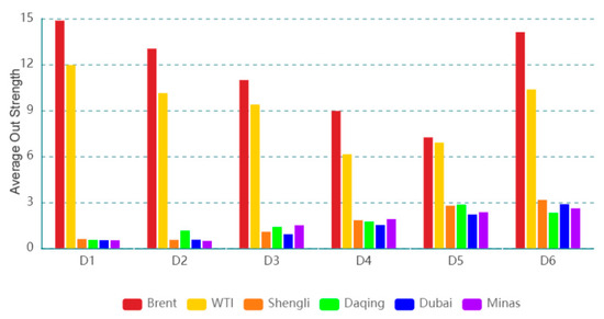 The dynamic out strength for each oil series on a time scale (D4) is presented in Figure 5, and the dynamic out strength for the oil series on the other time scales is exhibited in the Appendix A. The results suggest that the importance of information spillover sent by the oil series to others changes with time. The dynamic features of the dynamic out strength at various time scales are different, indicating that the dynamic features are related to time scales. Figure 6 displays the average out strength of an oil series at different time scales. For instance, Brent has the greatest average out strength, and Minas has the smallest value on time scale D1. The result reflects that Brent, as a spillover transmitter, has the greatest importance of information spillover and Minas as a spillover transmitter has the smallest importance of information spillover. With the increase in the time scale, the average out strength of Brent (WTI) shows a downward trend, and that of Daqing (Shengli/Dubai/Minas) exhibits an upward trend. This indicates that the importance of Brent (WTI) as a spillover transmitter for information spillovers shows a downward trend and that of Daqing (Shengli/Dubai/Minas) as a spillover transmitter shows an upward trend with an increase in the time scale.