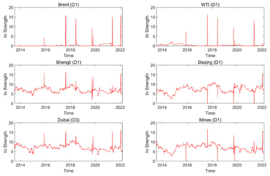 The strength of a node is a basic indicator of a network that measures the numbers and weights received by the node from its neighbors. This suggests the importance of the information spillover received by the oil series from its neighbors. The strength of node in an information spillover network, , is denoted as follows [34]: