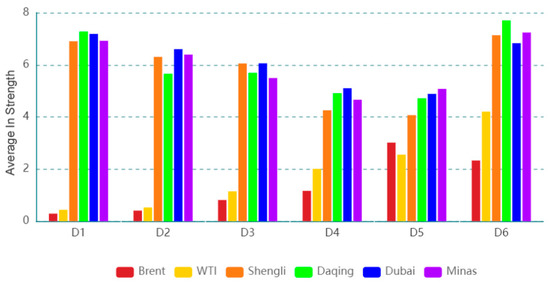 Figure 7 shows the dynamic in strength for each oil series on a time scale (D1), and the dynamics in strength for the oil series on the other time scales are exhibited in the Appendix A. The results indicate that the importance of information spillover received by the oil series from other oil series is time-varying. The dynamic features of dynamic in strength at various time scales are different, indicating that the dynamic feature is related to time scales. Figure 8 presents the average in strength of an oil series at different time scales. For instance, Brent has the smallest average in strength, and Daqing has the greatest value on time scale D1. The result implies that Brent, as a spillover receiver, has the smallest importance of information spillover, and Daqing, as a spillover receiver, has the greatest importance of information spillover. With the increase in the time scale, the average in strength of Brent (WTI) shows an upward trend, and that of Shengli (Dubai) exhibits a downward trend. This indicates that the importance for information spillovers of Brent (WTI) as a spillover receiver shows an upward trend and that of Shengli (Dubai) as a spillover receiver shows a downward trend with the increase in the time scales.