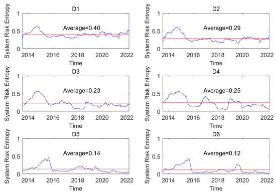 Furthermore, the trend of the system risk entropy during the whole sample period can be analyzed. For instance, the system risk entropy at time scale (D1) begins with the lower value and then spikes and declines. This result reflects that the indicator maintains a larger value compared with the mean value from the end of 2013 to the beginning of 2015, where the indicator decreases when the shale oil revolution in the United States in 2014 occurs. This suggests that the systematic risk based on entropy is lower during the period of global economic recovery and increases when crude oil prices plunge at the end of 2014. After that, the system risk entropy remains lower and exceeds the mean value until the end of 2019. The supply and demand in the global market change with time based on complex indicators, such as China–US trade frictions and the new agreement of OPEC, and the systematic risk was larger from 2015 to 2019. The system risk entropy became larger at the beginning of COVID-19 and then became smaller at the end of 2020 and again became larger at the second half of 2021. This result reflects that systematic risk based on entropy fluctuates over a large range during the period of the COVID-19 pandemic, indicating that it changes with higher uncertainty. The uncertain systematic risk entropy may give a sign of difficulty to hedge.