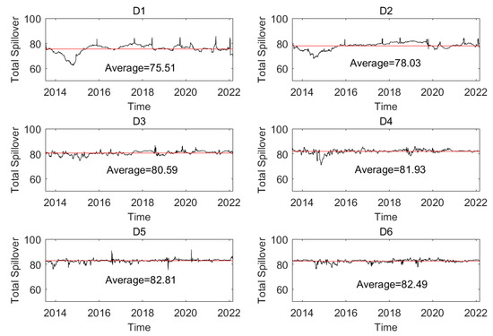 The dynamic total spillover in a network at different time scales is given in Figure 10, and it suggests that the total spillover on the short-, medium-, and long-term time scales changes with time. For instance, the total spillover at time scale (D1) belongs to (62.47,85.62), and the mean value of the total spillovers of all the networks is 75.51. With the increase in time scale, the mean value increases, which implies that the integration of the oil series increases. This indicates that systematic risk based on total spillover in the short-term period is smaller than that on the long-term time scale.