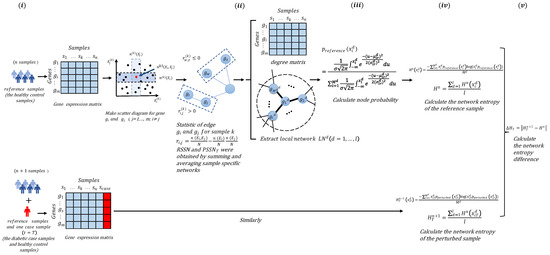 Schematic illustration of the degree matrix network entropy (DMNE) algorithm. (i) Construct the SSN of reference samples (the healthy control samples) and perturbed samples (the diabetic samples), respectively. (ii) Extract degree matrix and local network. (iii) Calculate the node probability for every gene by fitting a Gaussian distribution. (iv) Calculate the network entropy of reference samples and perturbed samples. (v) Calculate the differential network entropy based on the degree matrix to obtain DMNE score.