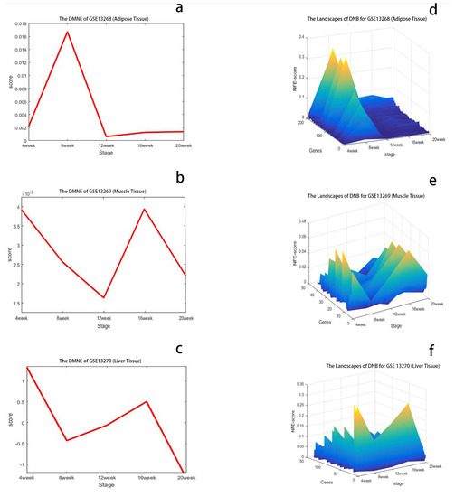 Here, we apply the DMNE method to detect the critical transitions during T2DM development and progression accompanying insulin resistance in rat adipose, gastrocnemius muscle, and liver corresponding to the GSE13268, GSE13269, and GSE13270 datasets, respectively, which each contain 25 reference and 25 case samples. In the case samples, there are five samples at each stage. At each stage, the DMNE score is calculated. The top 200 genes (1.5% of all expressed genes) with the highest DMNE score at the critical state are regarded as DNBs.