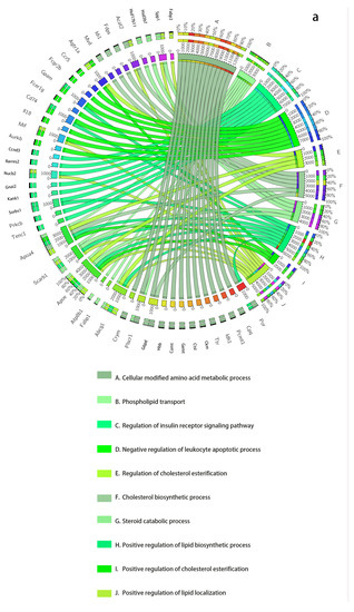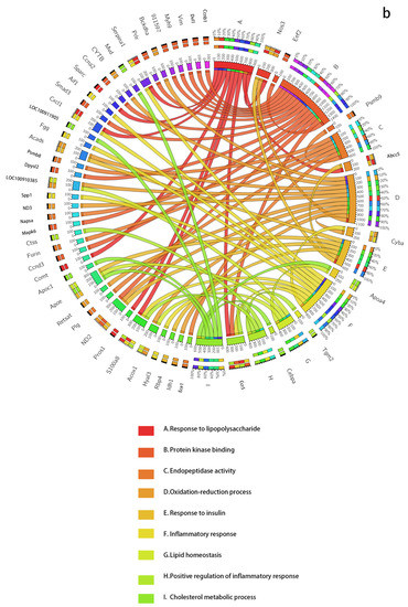 The dynamic network biomarkers (DNBs) of GSE13268, involving rat adipose tissue, are involved in important biological processes of T2DM. (a) All Rattus norvegicus genes as background. (b) The genes that passed the previous filtering steps as background. The left side of the outer ring represents the detected DNB members, and the right side represents detailed biological processes in which these genes are involved. In the inner ring, the color and width of links indicate diverse enrichment pathways and significant levels of gene functions, respectively.