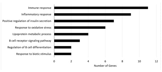 To further confirm the effectiveness of the “dark genes”, we subjected them to GO and KEGG enrichments analyses. BCKDHA exists in liver tissue and encodes the BCKDC component. In the study of [45], it was found that knocking out the BCKDK gene, which regulates BCKDC kinase, can significantly reduce the concentration of branched-chain amino acid (BCAA) in blood. BCAA can stimulate mammalian targets of rapamycin and S6 kinase. It can also phosphorylate insulin receptor substrate on serine residues, thus damaging insulin signaling pathways. The decrease in BCAA catabolism will lead to insulin resistance and glucose intolerance, eventually leading to T2DM. Therefore, the increase in BCKDHA expression will cause a decrease in plasma BCAA concentration, subsequently affecting the progression of T2DM, which can explain why the low BCKDHA expression is associated with favorable prognosis [43]. COL1A1 contributes to T2DM via the ECM–receptor interaction pathway. ECM–receptor interactions are microenvironmental regulators of the structure and function of cells and tissues. ECM synthesis is closely linked to the PI3K/Akt pathway and the regulation of T2DM [46,47]. The enrichment analysis of these “dark genes” also showed that their associated pathways provided in Figure 4 are related to T2DM. Figure 4 shows the enrichment pathways of “dark genes” and the number of involved genes.
