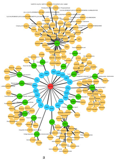 The critical state of GSE13268 is the second stage, the critical states of GSE13269 are the first and fourth stages, and the critical states of GSE13270 are the first and fourth stages. Figure 5 shows the drug target analysis for the critical states of GSE13270. The drug target analyses [51,52,53,54,55] of GSE13268 and GSE13269 are provided in Supplementary Materials Sections S3 and S4.