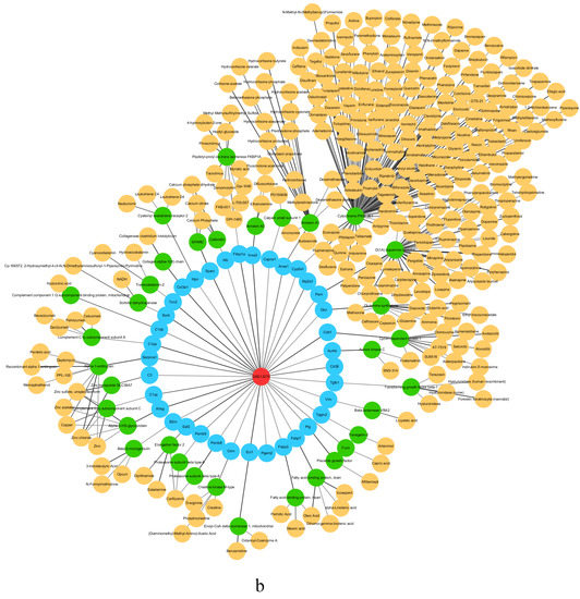 The drug target analysis in GEO study GSE13270 (rat liver tissue) showing the drug targets and corresponding protein and targeted drugs at (a) stage I and (b) stage IV.