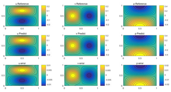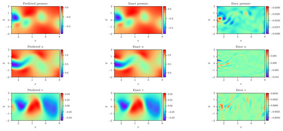 Numerical results of the Navier–Stokes equation in the way of the dwPINNs are displayed in Table 5. Compared with PINNs, dwPINNs have less training time and higher prediction accuracy. Then, after applying noise to the original training data, the calculation was performed using the dwPINNs method. We observed that even if the training data are corrupted with uncorrelated Gaussian noise, the method can identify unknown parameters very accurately and , indicating that our method has good stability.