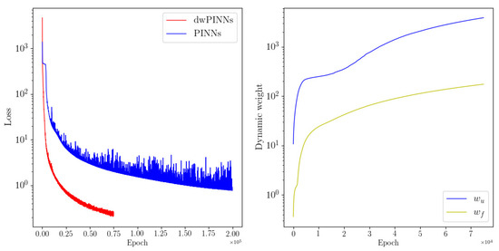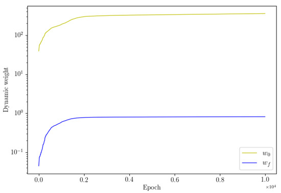 In order to overcome the above problems as much as possible, Algorithm is adopted. To strengthen the condition of balancing weight update, we update the weight only when the condition is satisfied. As far as possible, to make the weight sequence meet the convergence conditions, reducing the fluctuation of has an adverse effect on our method. In our implementation of dwPINNs, we use Tensorflow with a fixed number of iterations of Adam followed by another fixed number of iterations of the L-BFGS quasi-newton method [27,28]. This is consistent with the PINNs formulation in [9], as well as follow-up literature [11]. The adaptive weights are only updated in the Adam training steps and are held constant during L-BFGS training. The dwPINNs algorithm is summarized.