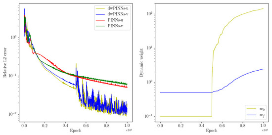 Next, considering whether dwPINNs can still work in the middle and later stages of training, we design the following experiment. After PINNs are normally trained 5000 times, we conduct dynamic weight strategy training 5000 times and take PINNs as the control group of the experiment. The results are shown in Figure 3. It can be clearly seen from the figure that the dynamic weight strategy can accelerate the convergence of error in the middle and later stages of training.