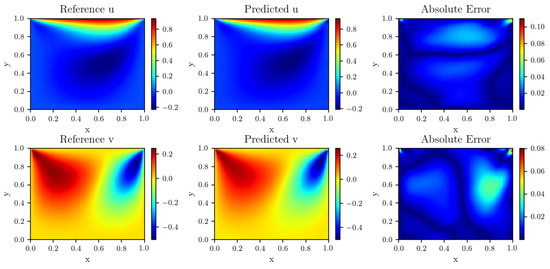 The lid-driven cavity flow is a standard test case for verifying the accuracy of new computational methods for incompressible Navier–Stokes equations. Although, there are many papers in the literature that present results of the lid-driven cavity with different formulations, grids and numerical methods, we shall compare the results with Wang [18], where they used a Learning rate annealing for PINNs. The domain is and no-slip boundary conditions are applied at the left, bottom and right boundaries. The top boundary moves with constant velocity in the positive x direction. is a velocity vector field, p is a scalar pressure field. .