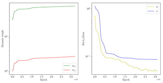Parameters during training are as follows: 10,000, . The network structure is a 4-layer deep fully-connected network with 50 neurons per layer. The results of this experiment are summarized in Table 2. It represents average relative L2 error of across 10 runs with random restarts. Figure 4 summarizes the results of our experiment, which shows the magnitude of the predicted solution u, v and absolute point-wise error predicted by dwPINNs, after 32,000 stochastic gradient descent updates using the Adam optimizer. Figure 5 is the convergence process of dynamic weights and the relative L2 error of u and v.